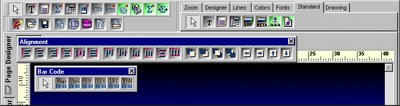 Rave's many toolbars make it easy to design even the most complicated report. The toolbars include: Project, Designer, Zoom, Alignment, Color, Line, Font, Standard, Drawing, Report and Barcode component toolbars. Since it is possible to create and install new components, you may have other component toolbar buttons in your designer.