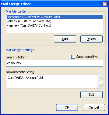 Memo - This component is used to display fixed text in a word wrapped fashion on your report. Using the MailMergeItems property and the Mail Merge Editor shown below, you can create a mail merge type of report where Rave will replace tokens in the memo text with a replacement string. Note that this replacement string can be edited with the Edit button, which will display the Data Text Editor for quite a bit of extra functionality.